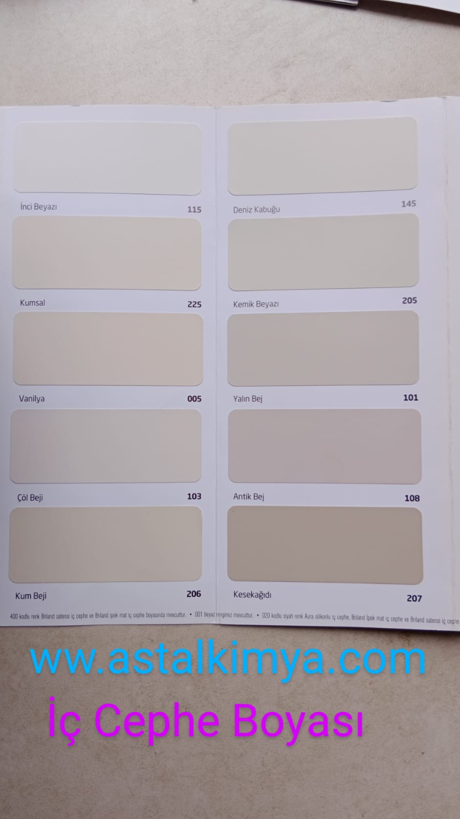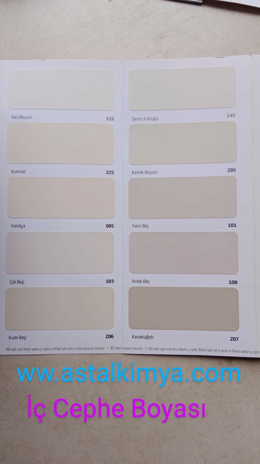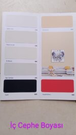 BEYAZ , KEMİK BEYAZI,  İNCİ BEYAZ,  BUZYALIN BEJ, KESE KAGIDI, KUMSAL, VANİLYA, KUMBEJİ,  ŞAMPANYA, ŞİRİN PEMBE, ŞEKER PEMBE, FISTIK YEŞİLİ, CAM GÖBEGİ, HAVAİ MAVİ,  RÜZGAR, LİLA,  ASİL LİLAİ, BUZ MAVİSİ, FİLDİŞİ, SİYAH, BUZ GÜMÜŞÜ,  SİS BEYAZI, DENİZ TUZU, MELEK KANADI,  LİMON, AÇIK ŞAMPANYA, KREM, SAHRA BEJİ